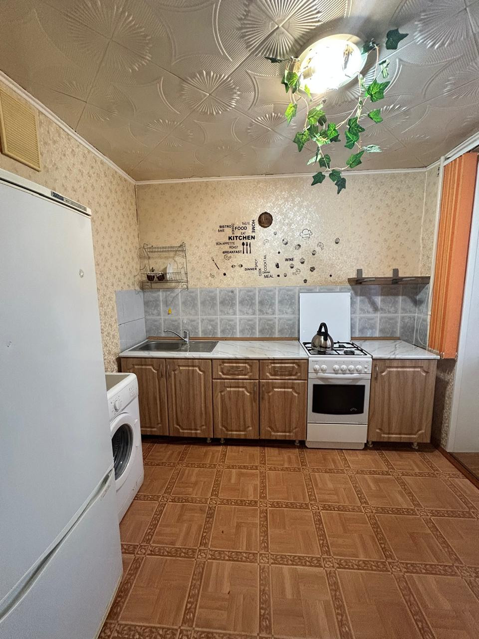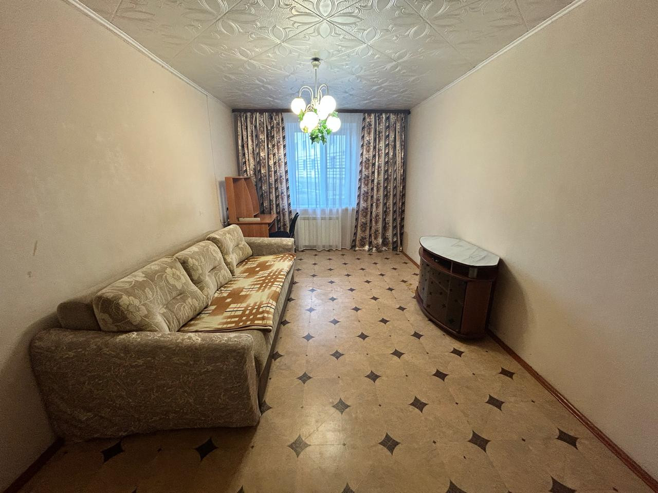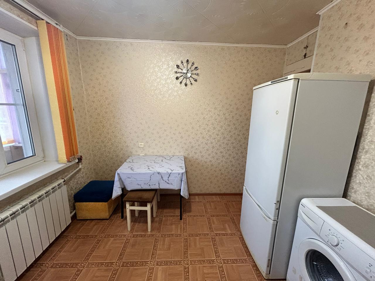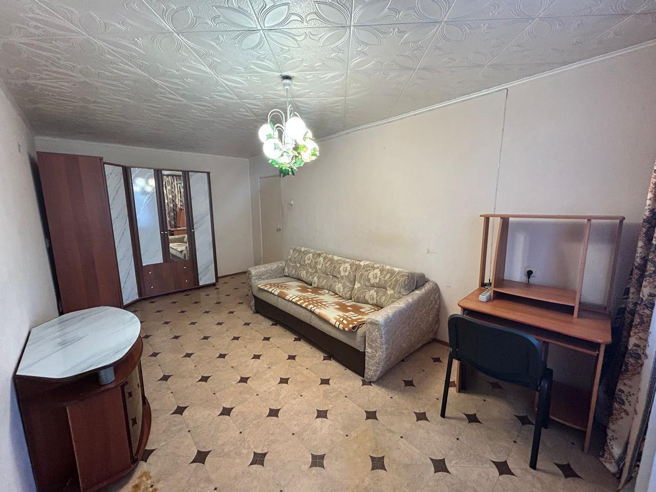 Квартира с полной комплектацией: мебель, холодильник, стиральная машина, диван, шкаф, тумба под ТВ, компьютерный стол и стул.